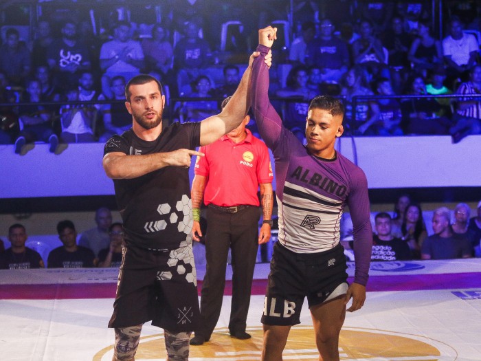 O acrobático marrom Victor Honório Em um dos GPs de Pesos Pesados mais eletrizantes da Copa Podio, um duelo de faixa-marrom contra faixa-preta ficou tatuado na memória. Mesmo com nomes de peso como Vinny Magalhães, Erberth Santos, Delson “Pé de Chumbo” e Tim Spriggs na disputa, a luta mais falada do evento foi Victor Honório contra Felipe Preguiça. Felipe era um dos favoritos ao título, e Honório entrou na luta como franco-atirador na última luta da quinta rodada. Por cima, Victor fez suas pegadas dominantes e abriu a caixa de ferramentas com uma sequência alucinante de saltos, tentando passar a ferrenha guarda do grandalhão da Gracie Barra. Seus pulos não foram suficientes para estabilizar no controle lateral, mas as vantagens resultantes foram suficientes para levar uma histórica vitória para casa, por 2 a 1. Victor e Felipe voltaram a se enfrentar na final do GP, mas a experiência de Preguiça falou mais alto, e este pegou as costas de Honório para finalizar no mata-leão. Confira abaixo o jogo agressivo de Honório na fase de grupos da Copa Podio!
